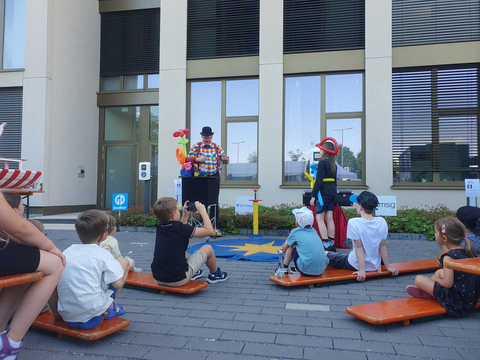 Es gab für alle kleinen und großen Gäste ein abwechslungsreiches Programm mit Tischkicker, einer Riesendartscheibe, Dosenwerfen, einer Clownaufführung sowie einem virtuellen Spaziergang mittels VR-Brille über eine Brücke.