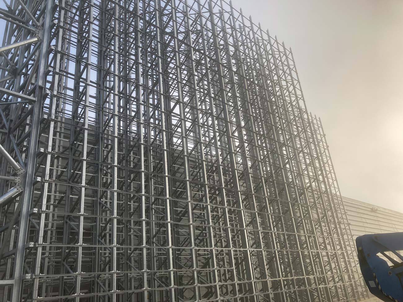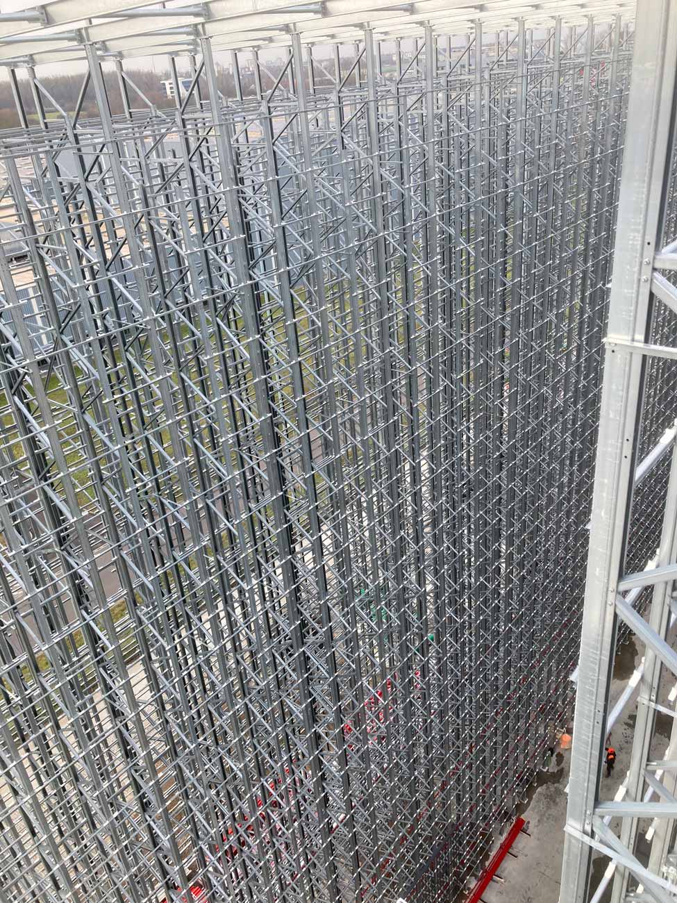 Zuvor waren 70.000 Stahlstäbe mit 300.000 Schrauben verbunden und das Regal auf mehr als 6 Tonnen Vergussmörtel aufgestellt worden.