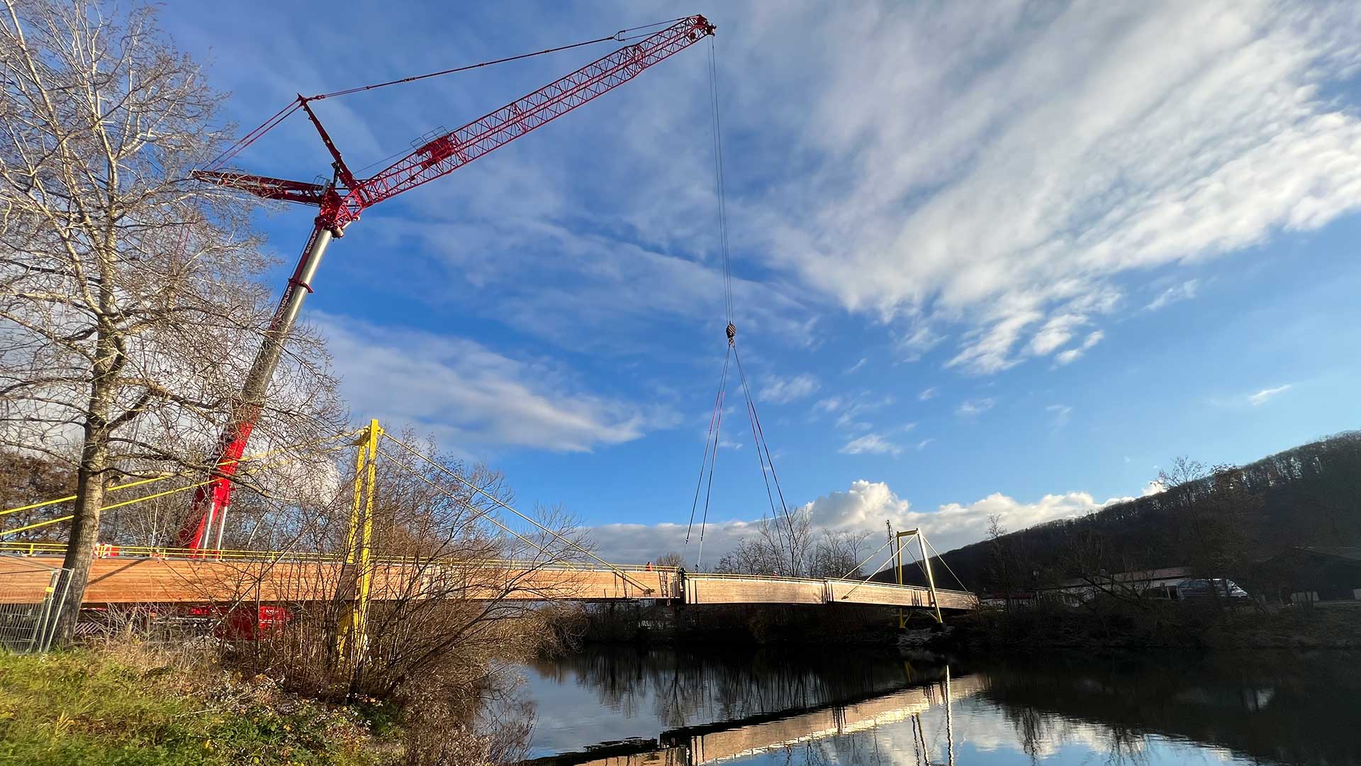 - Rad- und Fußwegbrücke als zweihüftige Schrägseilbrücke; Gesamtlänge 100 m; max. Spannweite 60 m