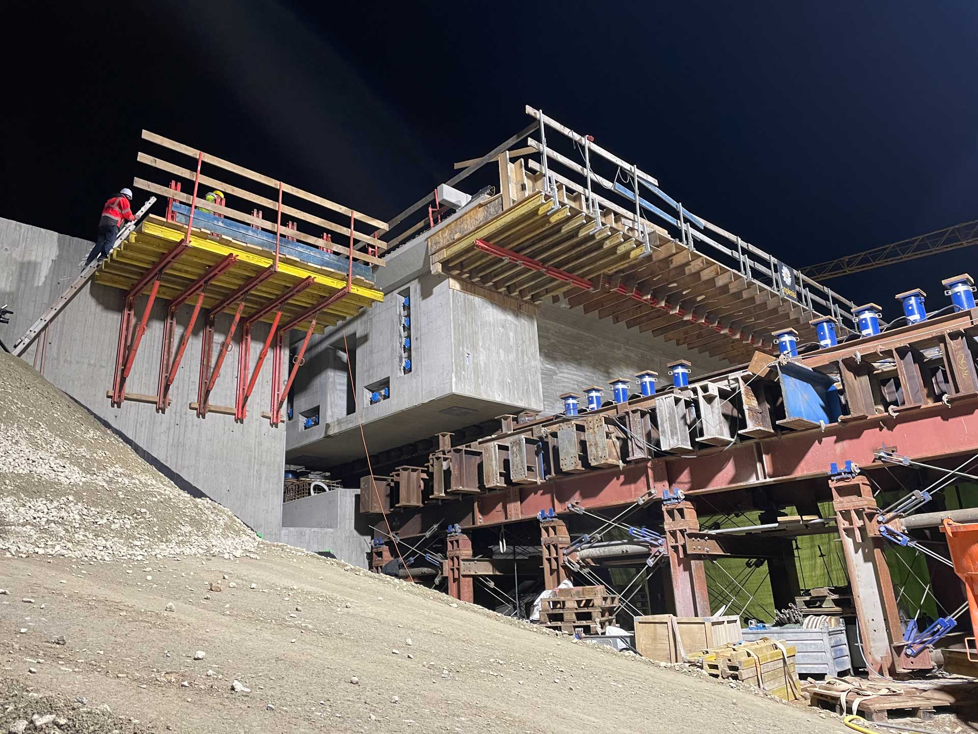 Der Überbau ist ca. 90 Meter lang und hatte eine Verschubmasse von ca. 4.100 Tonnen. Das Verfahren, um ihn in seine Endlage zu bringen, war daher anspruchsvoll und spektakulär zugleich. Der Überbau wurde auf Traggerüsten in ca. 7 Metern Höhe über vier Gleitbahnen zentimeterweise in Querrichtung verschoben. Auch die massigen Widerlager der Eisenbahnbrücke waren zuvor durch horizontalen Einschub in Brückenlängsrichtung an ihre Position gebracht worden.
