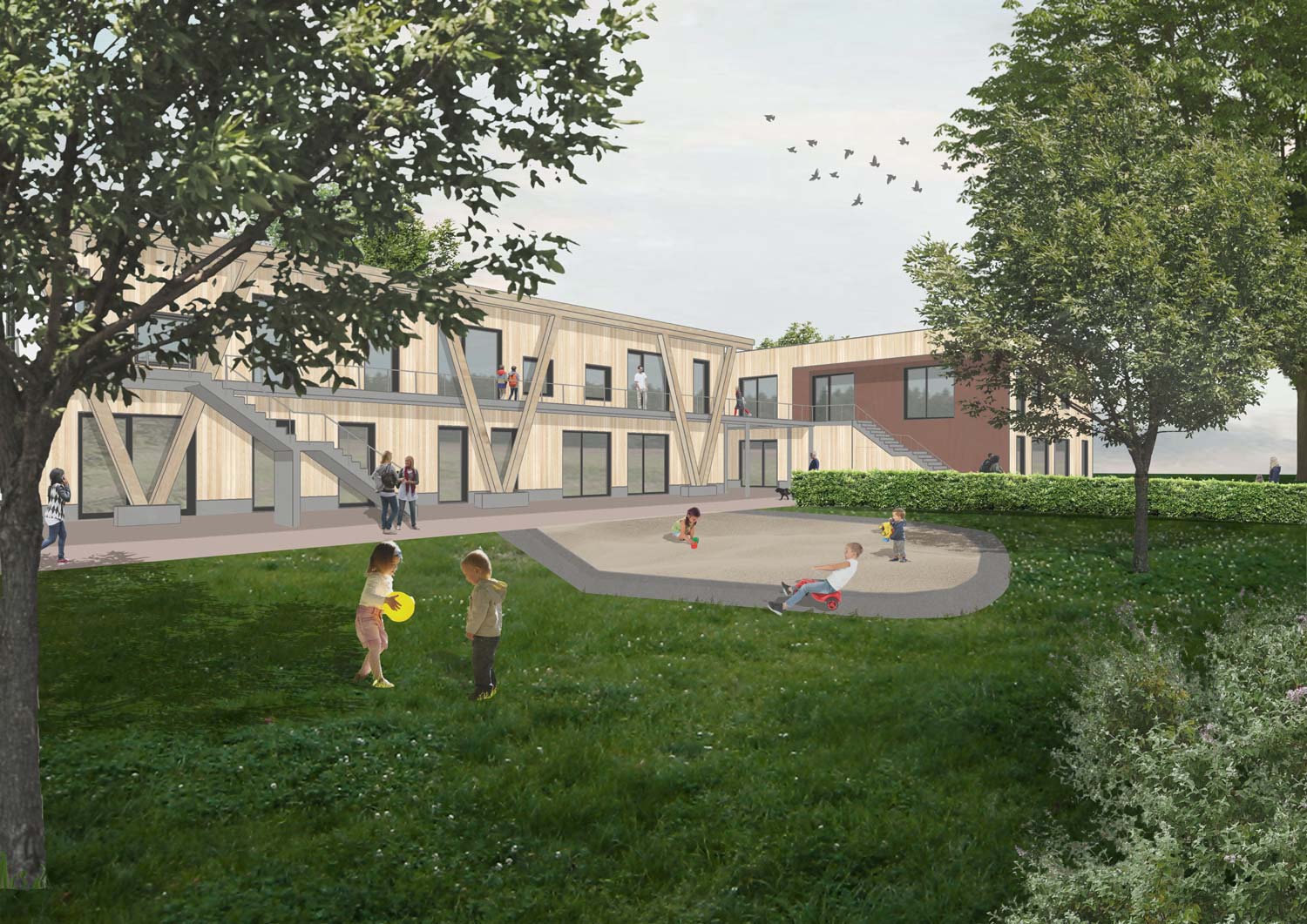 Neben der Kita entsteht ein Mehrgenerationenhaus, mittelfristig folgen sozial orientierte Wohngebäude – alles in nachhaltiger Holzbauweise, mit Photovoltaikanlage, Luft-Wärmepumpe und öffentlichen Grünflächen.