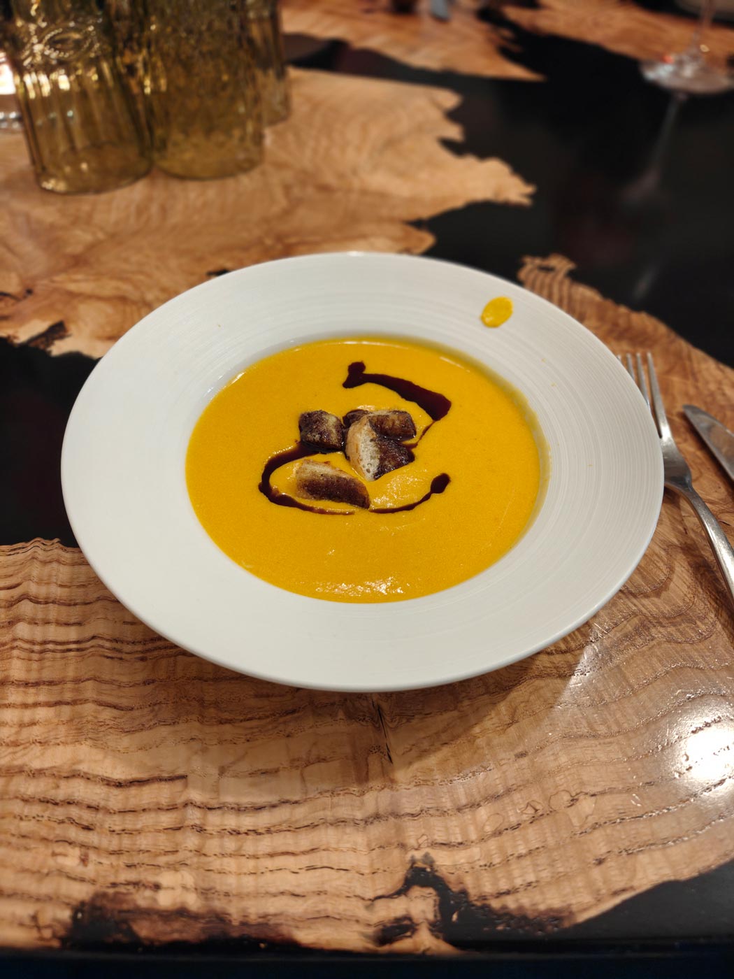 Eine aromatische Kürbiscremesuppe mit Zimt-Croutons und gerösteten Kürbiskernen – der perfekte Start! - Zwischengang: